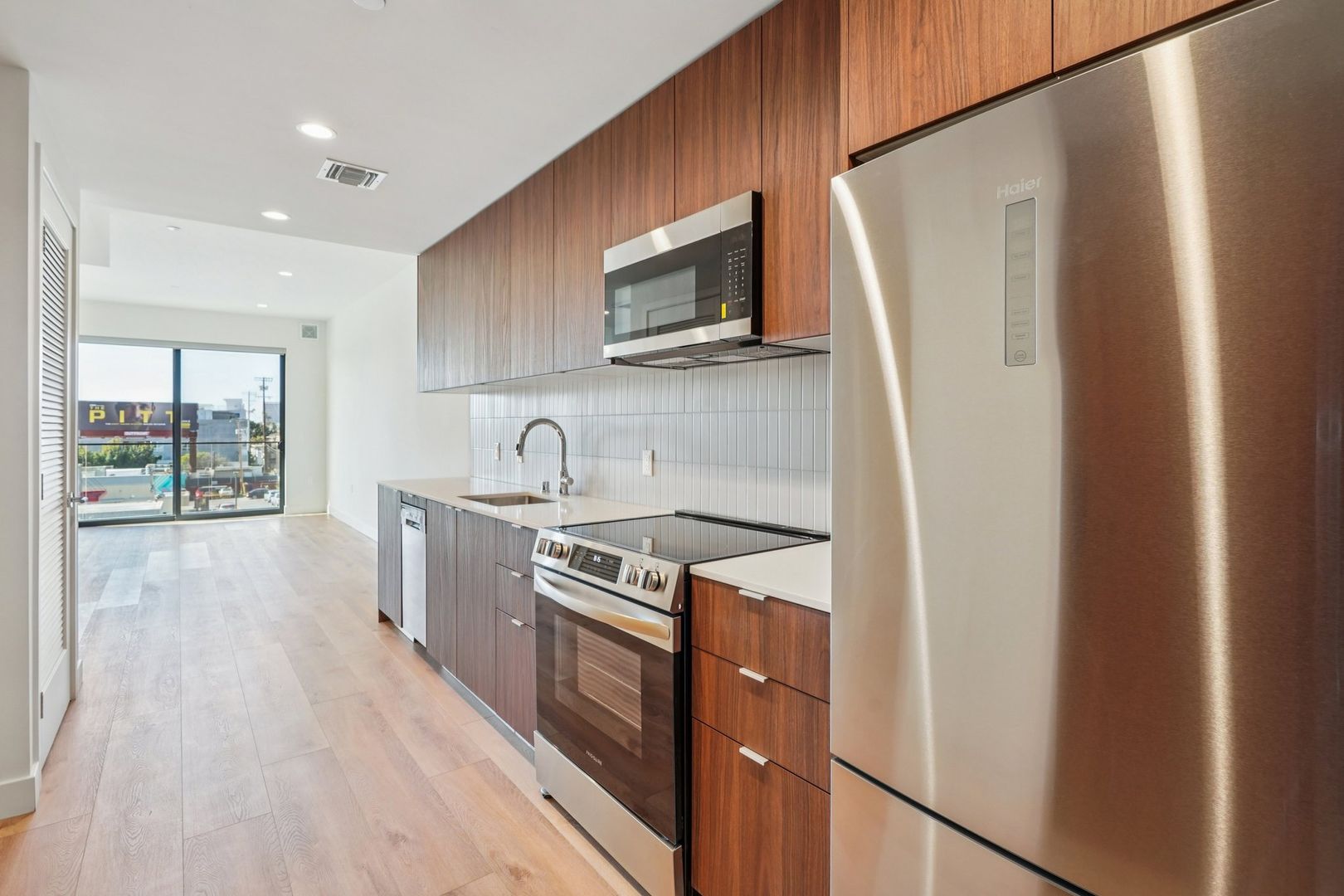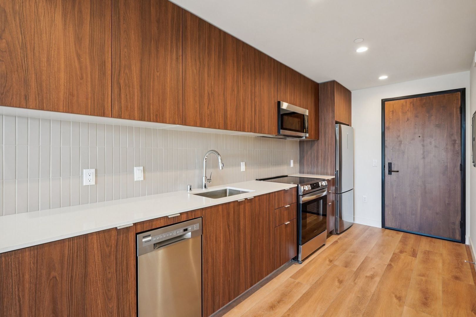Each residence is thoughtfully crafted for comfort and sophistication. Choose from studio, one-bedroom, two-bedroom, and townhouse-style floor plans, many featuring private balconies and abundant natural light. Inside, you’ll find walnut wood kitchen cabinetry, sleek quartz countertops, and stainless steel appliances. Every unit also includes an in-unit washer and dryer and central air conditioning and heating, providing effortless convenience and year-round comfort.